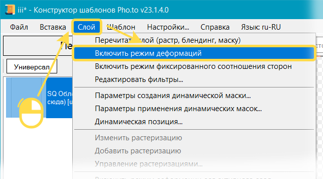 Для включения режима деформаций выберите область вписывания в списке слоев Конструктора шаблонов, а затем в меню нажмите