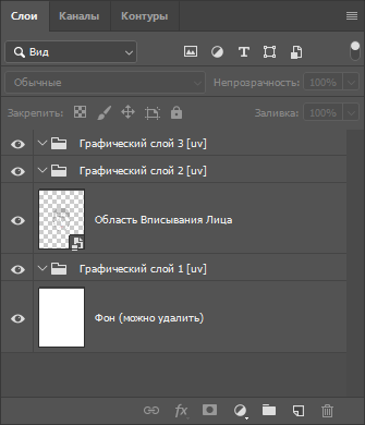 Элементы, составляющие структуру шаблона должны быть вам знакомы - это подгруппы графических слоев и специальный смарт-объект Область вписывания лица. Поскольку мы создаем шаблон с универсальной ориентацией, подгруппы слоев и смарт-объект располагаются на верхнем уровне слоев в PSD-документе.