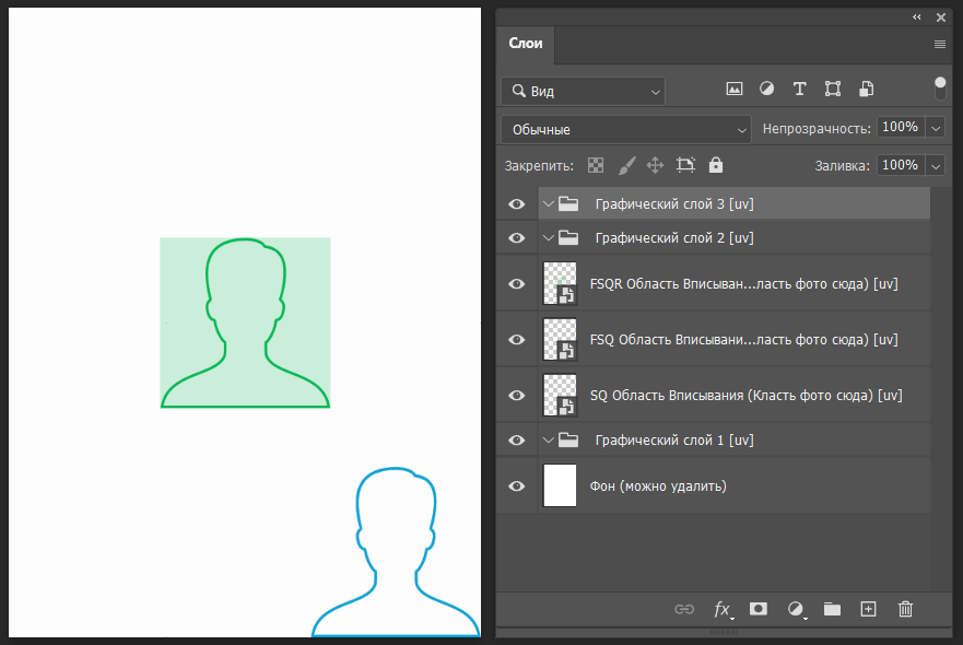 Контуры фигуры человека, которые отображаются в области вписывания без кадрирования (FSQ) в PSD-файле, являются условными и не гарантируют положение реальной фигуры человека на фотографии после обработки. Их назначение — облегчить визуальное различие типов слоев.