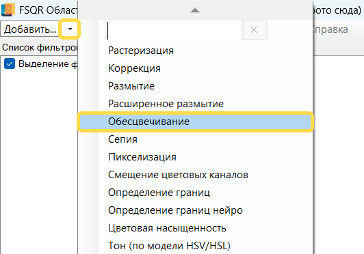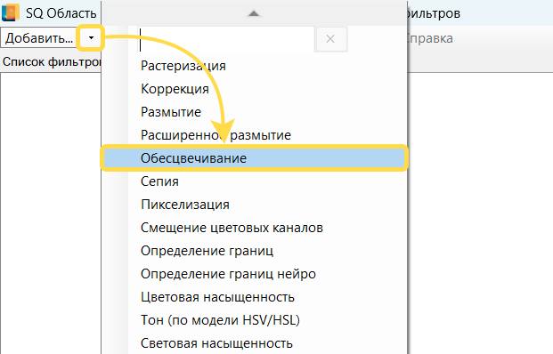 Добавим к области вписывания SQ Область вписывания фильтр Обесцвечивание для реализации нашей художественной задумки. Для этого кликнем правой кнопкой мышки по SQ Область вписывания и в контекстном меню выберем . Затем в окне добавим фильтр Обесцвечивание.