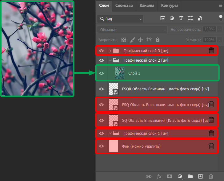 Для выполнения данной творческой идеи нам понадобятся только область вписывания типа фигура FSQR <название> и одна подгруппа графических слоев, расположенная выше области вписывания. Поэтому удалим области вписывания SQ <название> и FSQ <название> и остальные подгруппы графических слоев, а также удалим слой Фон.