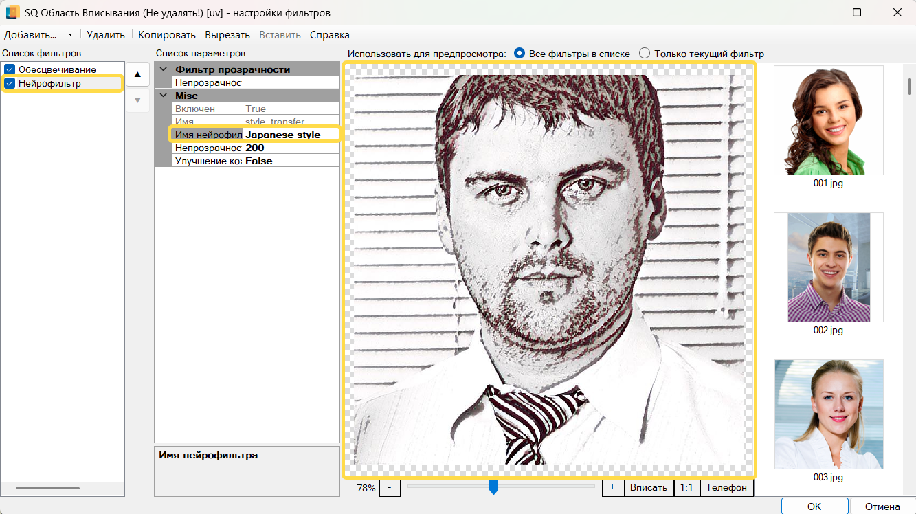 Далее необходимо добавить Нейрофильтр, для этого также в верхней панели меню нажмите кнопку и выберите нужный фильтр в списке. Для параметра выберем значение .