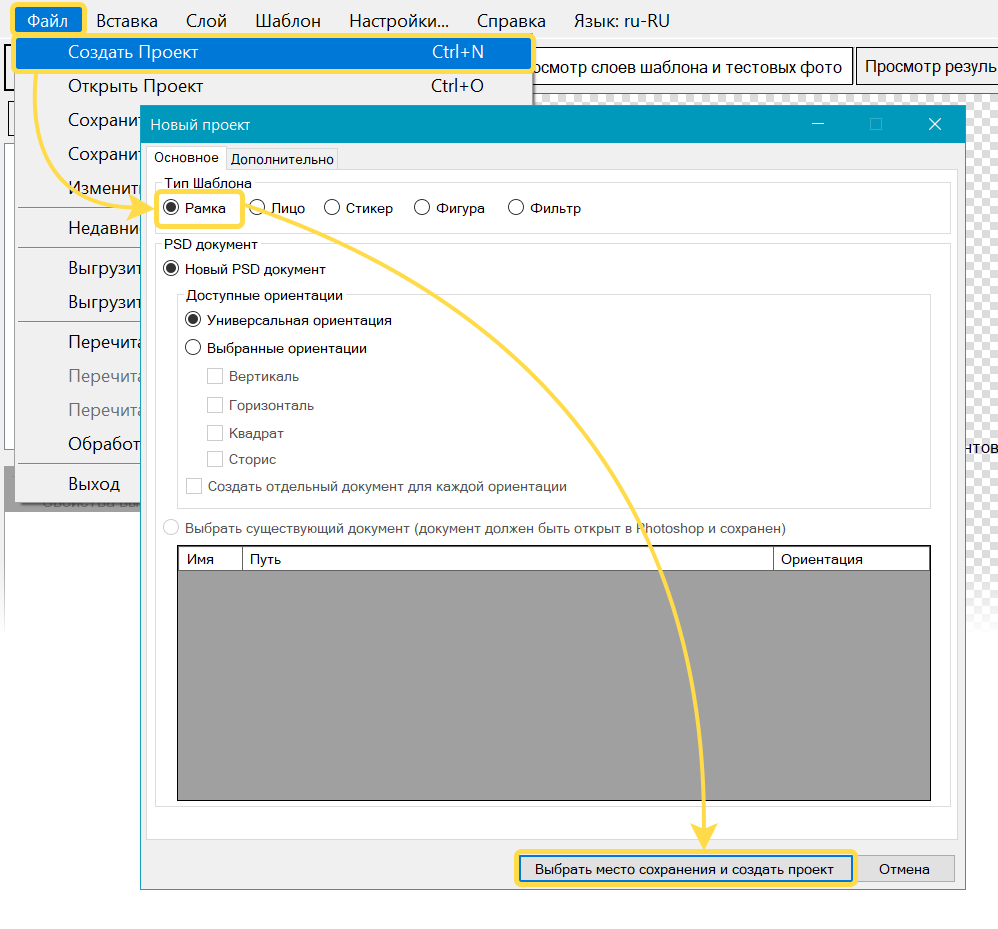 Рекомендуется заранее выбирать тип шаблона в соответствии с творческой задумкой. Впоследствии можно добавлять области вписывания разных типов, но важно учитывать, что размер итогового изображения зависит от выбранного типа шаблона.