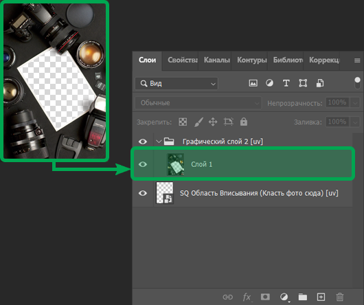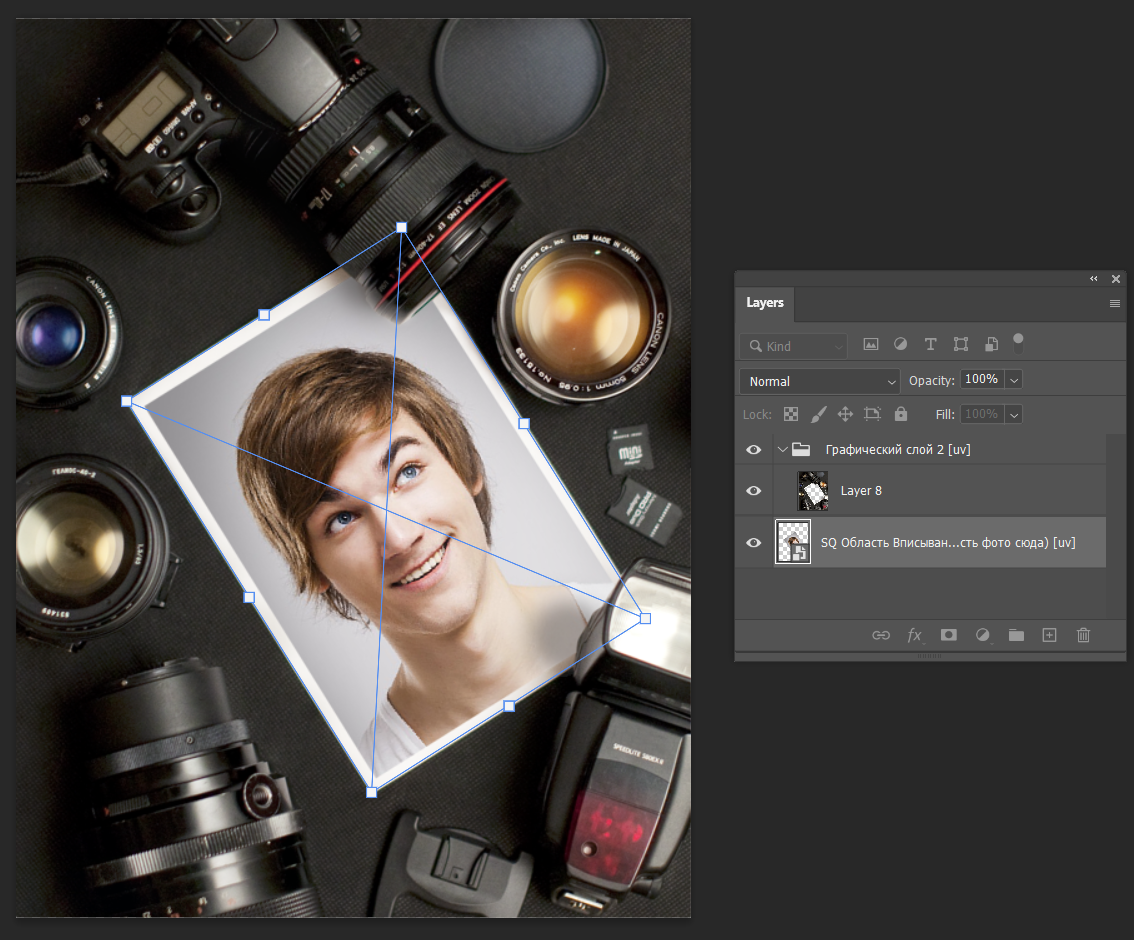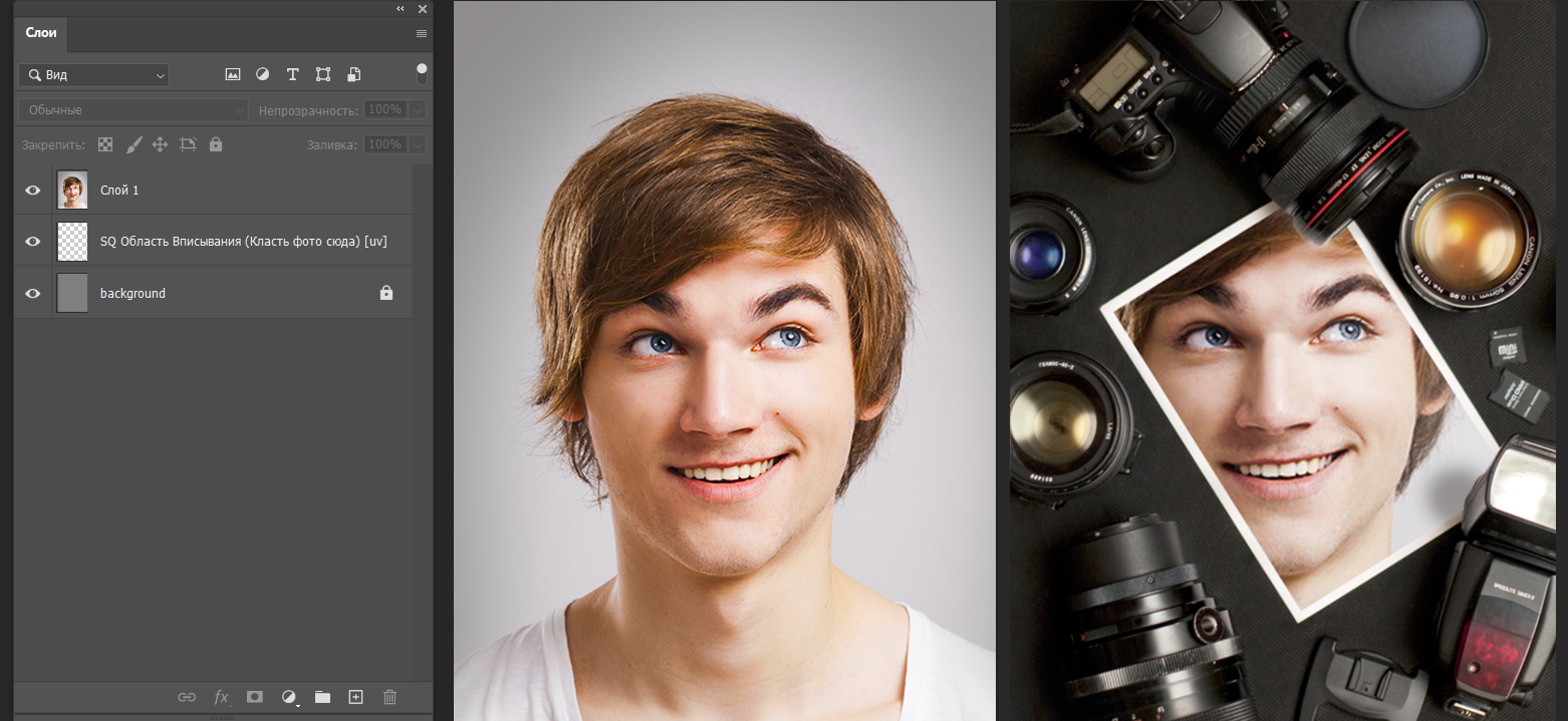 Добавьте тестовую фотографию внутрь смарт-объекта, чтобы оценить, как она вписывается в изображение-шаблон. Это поможет определить оптимальное расположение области вписывания. Подробнее о примерке тестовых фотографий вы можете прочитать здесь.