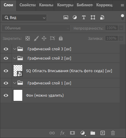 Элементы, составляющие структуру шаблона должны быть вам знакомы - это подгруппы графических слоев и специальный смарт-объект SQ Область вписывания. Поскольку мы создаем шаблон с универсальной ориентацией, подгруппы слоев и смарт-объект располагаются на верхнем уровне слоев в PSD-документе.