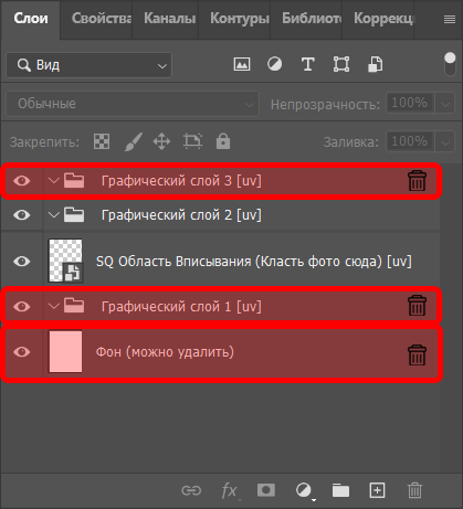Для выполнения данной творческой идеи нам потребуется только одна подгруппа графических слоев, которая должна находиться выше области вписывания в списке слоев PSD-документа. Поэтому удалим две другие подгруппы, так как они не нужны. Также удалим слой Фон.