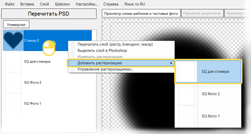 Через меню добавим слой со стикером. Для работы стикеру необходим фильтр Растеризация на области вписывания, поэтому добавим еще одну область вписывания () с названием SQ для стикера.