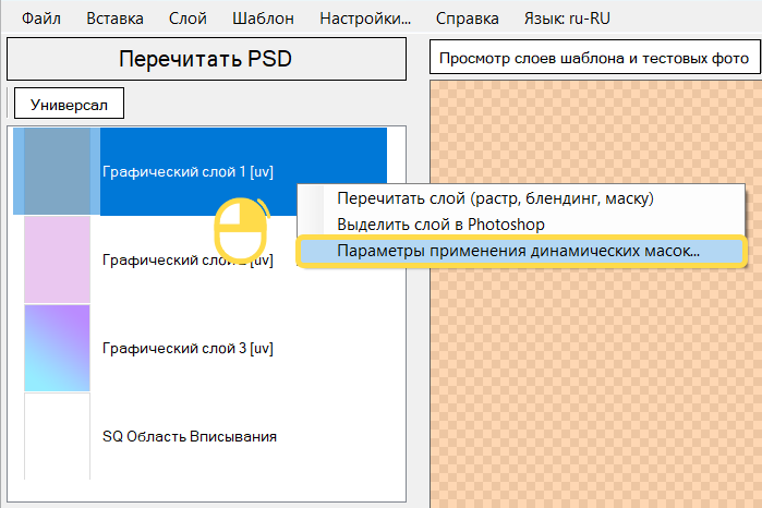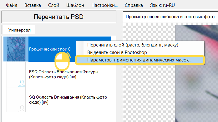 Вернемся в Конструктор шаблонов и нажмем . Применим к графическому слою Фиолетовый динамическую маску (кликнем правой кнопкой мыши по слою Фиолетовый и в выпадающем меню выберем ).