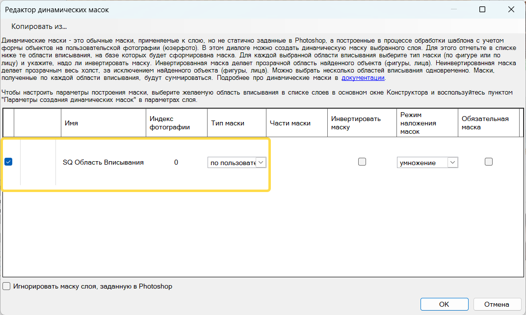 Далее в поставьте галочку напротив SQ Область вписывания и задайте параметры маски: - .