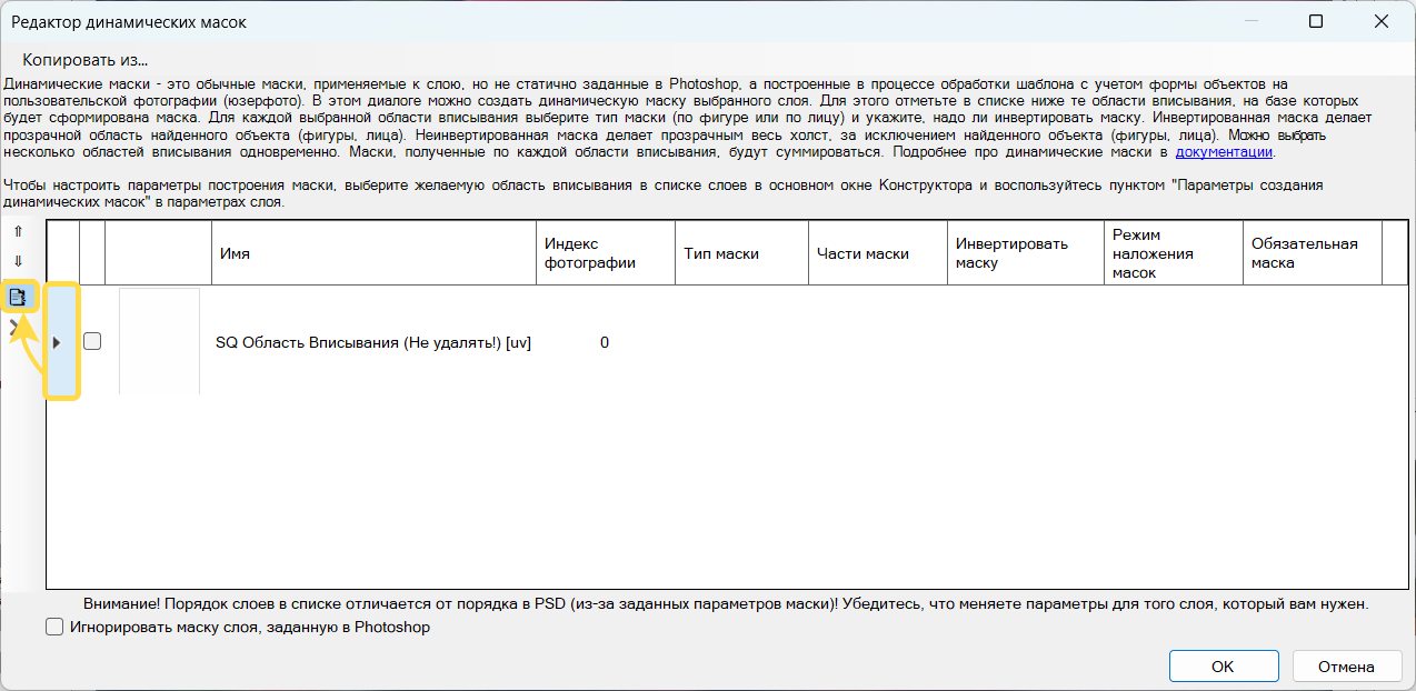 Для создания копии источника нажмите на область слева от галочки выбора SQ Область вписывания. После этого станет активна дополнительная панель для работы с источниками масок. Нажмите кнопку для создания копии источника, в нашем случае будет создана копия SQ Область вписывания.