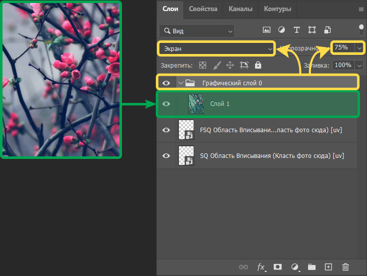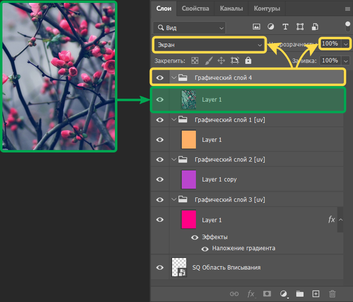 Добавим для подгруппы Графический слой 4 блендинг Экран (Screen) и — .