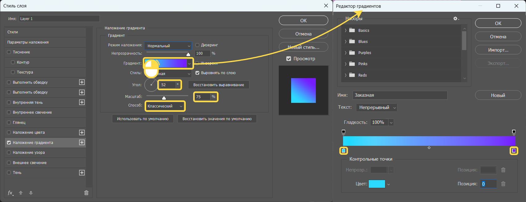 Цвета градиента: в контрольной точке 0 - #2ddaff, в точке 100 - #761aff, Угол 52°, Масштаб 75%, Способ Классический.