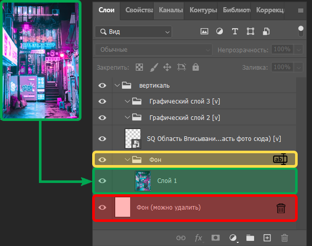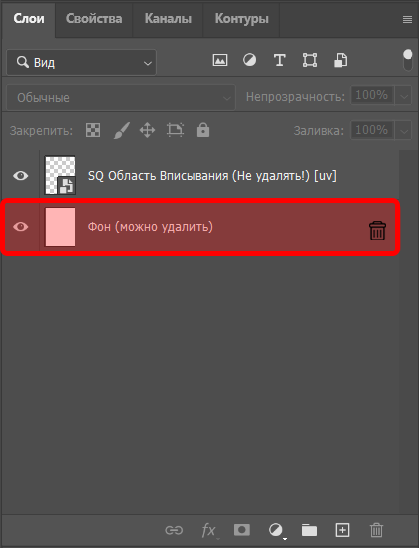 Перейдем в Photoshop. Удалим Графические слои 1,2,3 и Фон, а область вписывания переименуем в SQ Фото 1.