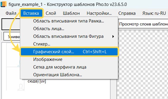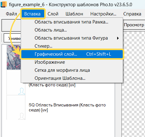 Перейдем в Конструктор шаблонов и вставим графический слой с помощью меню Вставка > Графический слой....