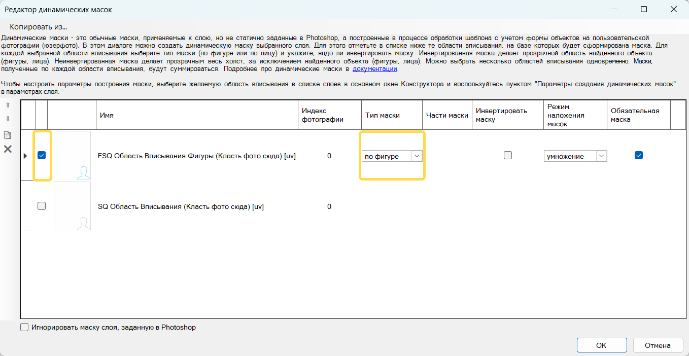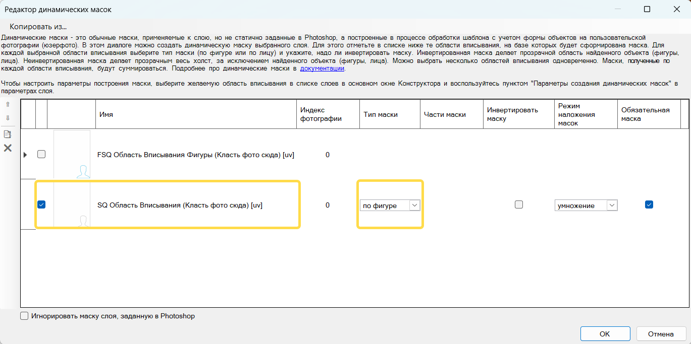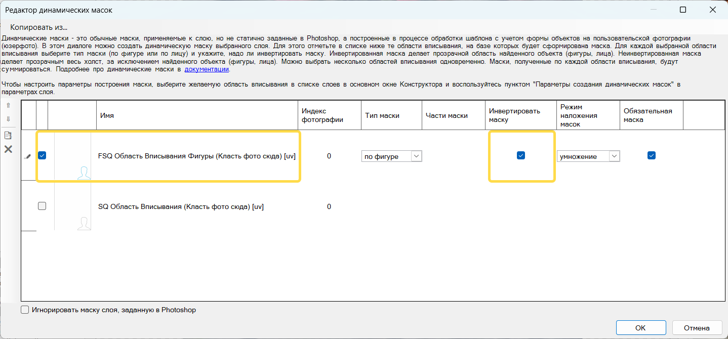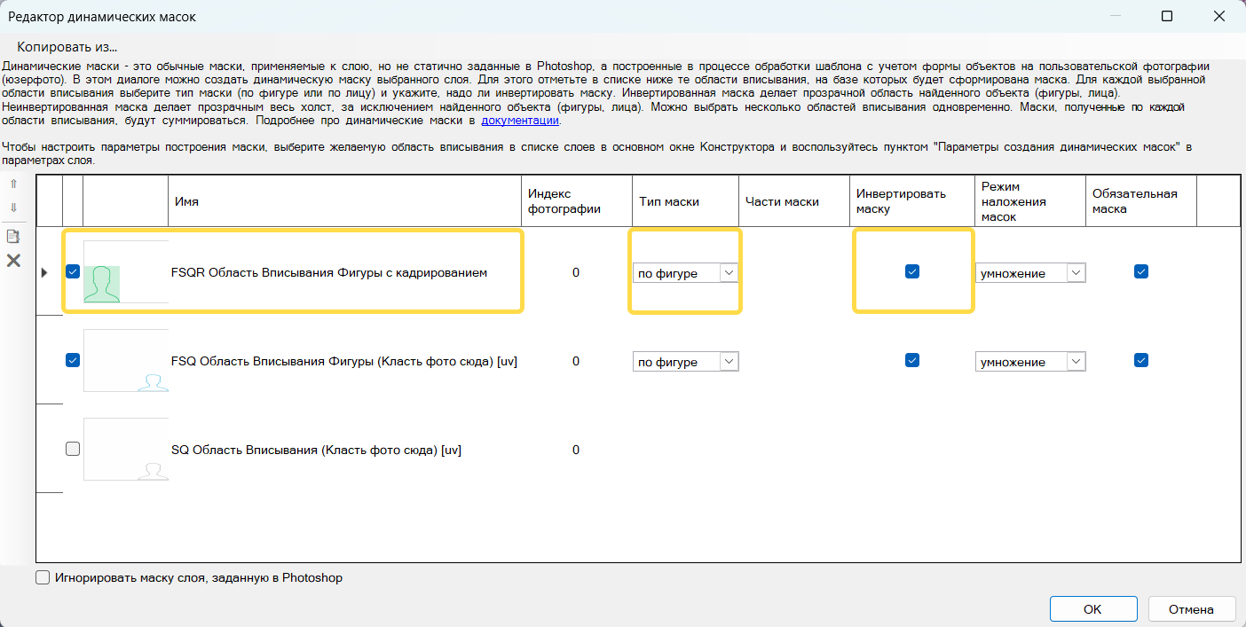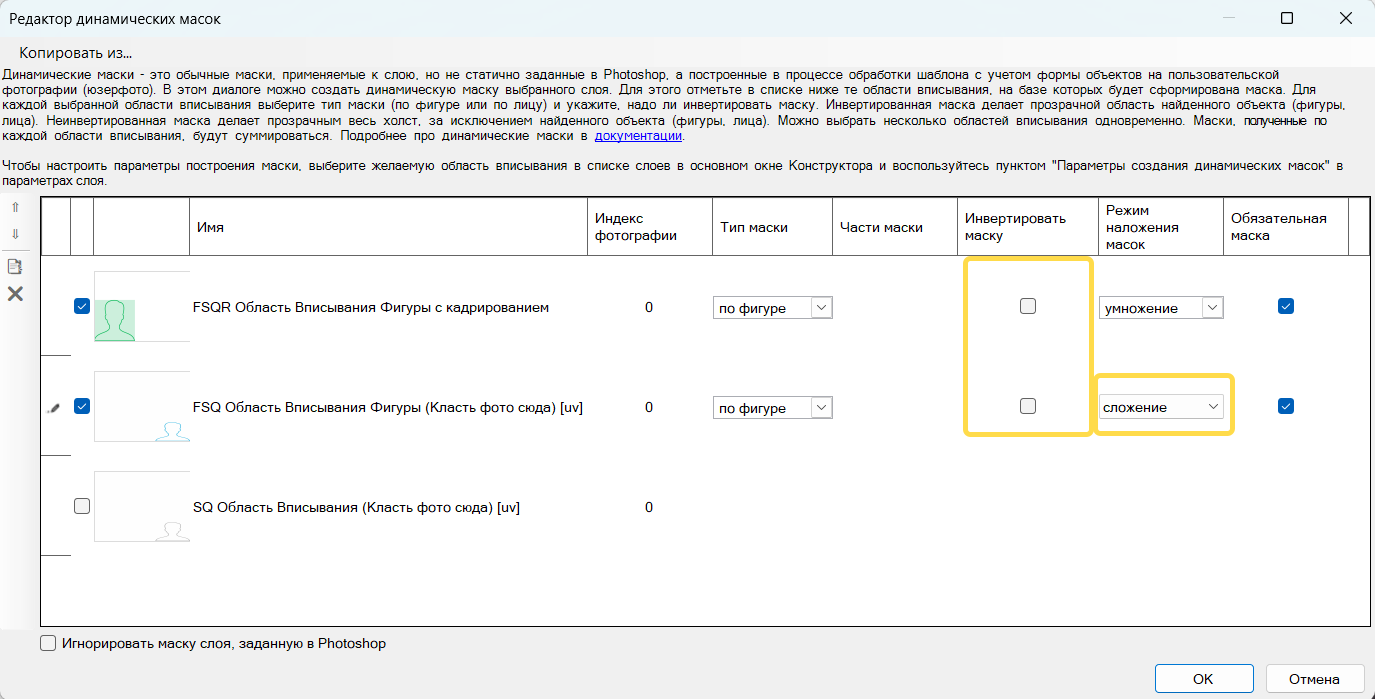В данном случае режим наложения масок для первой в списке области вписывания на результат не влияет. В нашем примере режим наложения масок для FSQR области вписывания фигуры можно не менять.