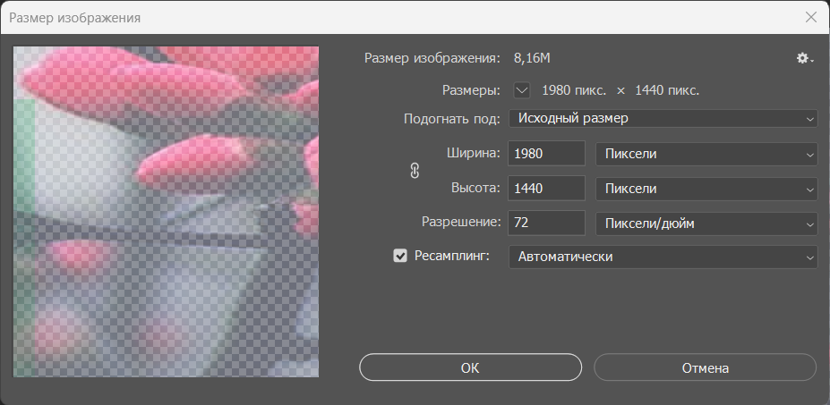 Затем для наглядности в Photoshop изменим размер изображения основного документа, чтобы холст имел горизонтальную ориентацию — это облегчит размещение двух областей вписывания типа Фигура. Установим ширину 1980 px, а высоту — 1440 px.
