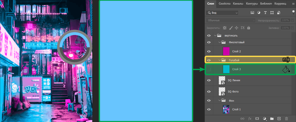 Повторим операции для подгруппы Графический слой 2: переименуем ее в Голубой и добавим новый слой с голубой (#7bc8ff) заливкой. Пока временно уберем видимость этого слоя.