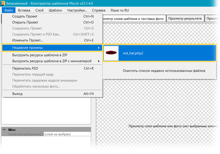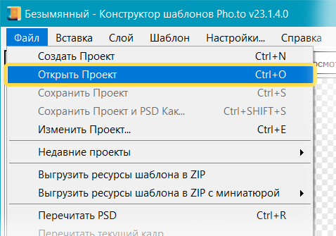 - PSD-файл был переименован. Чтобы избежать этой проблемы, переименовывайте PSD-файл вместе с файлом проекта, выбрав в основном меню Конструктора шаблонов.