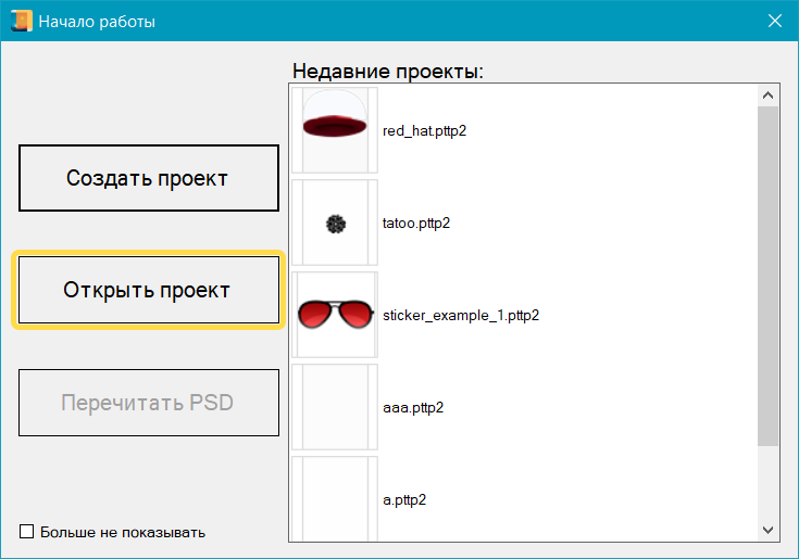 Нажмите , чтобы открыть проект, не привязывая к нему PSD-файл. Эта опция доступна, только если проект содержит графику, полученную при перечитывании PSD. Вы сможете тестировать шаблон на юзерфото, но не сможете вносить изменения в графику шаблона. Подробнее про требования к передаче проекта без PSD читайте в пункте Ограниченный доступ в разделе Как передать проект коллеге.