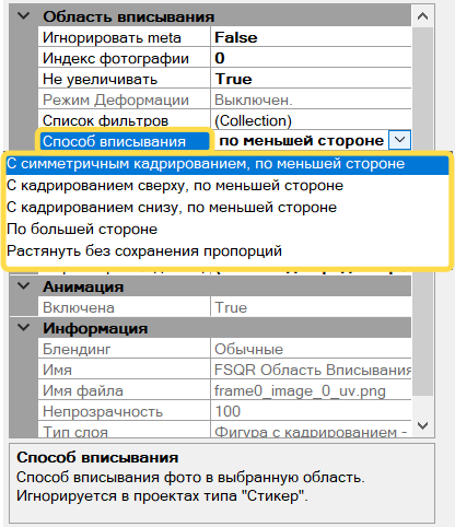 Настройка способа вписывания фотографий производится в свойствах выбранной области вписывания. Для этого нужно обратиться к блоку свойств, расположенному под списком слоев, и выбрать нужный вариант вписывания из выпадающего списка параметра