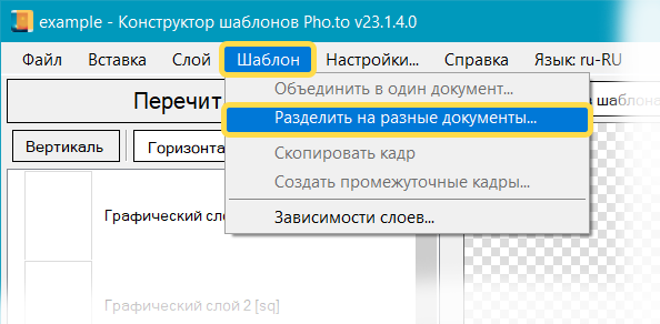 Иногда при работе с шаблоном, содержащим разные ориентации в одном PSD-файле, необходимо разнести его ориентации в разные документы. Это можно сделать с помощью Конструктора шаблонов.