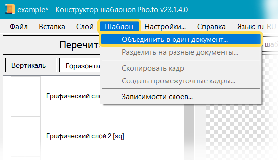Конструктор шаблонов позволяет объединять PSD с разными ориентациями в единый документ. Для этого необходимо в верхнем меню нажать .