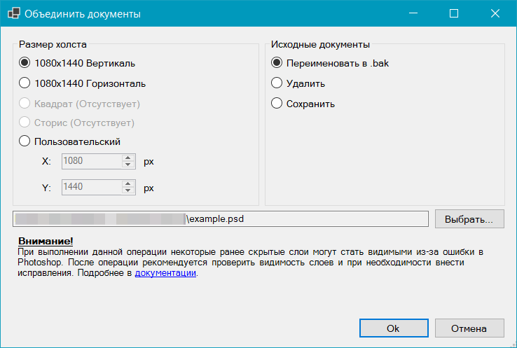 В появившемся диалоговом окне можно уточнить размер холста для общего PSD. В правой секции окна выберите действие для исходного документа: (создать резервную копию), или .