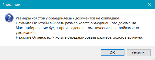 В случае, если объединяются документы, размеры холстов которых не совпадают, Конструктор шаблонов предупредит об этом.